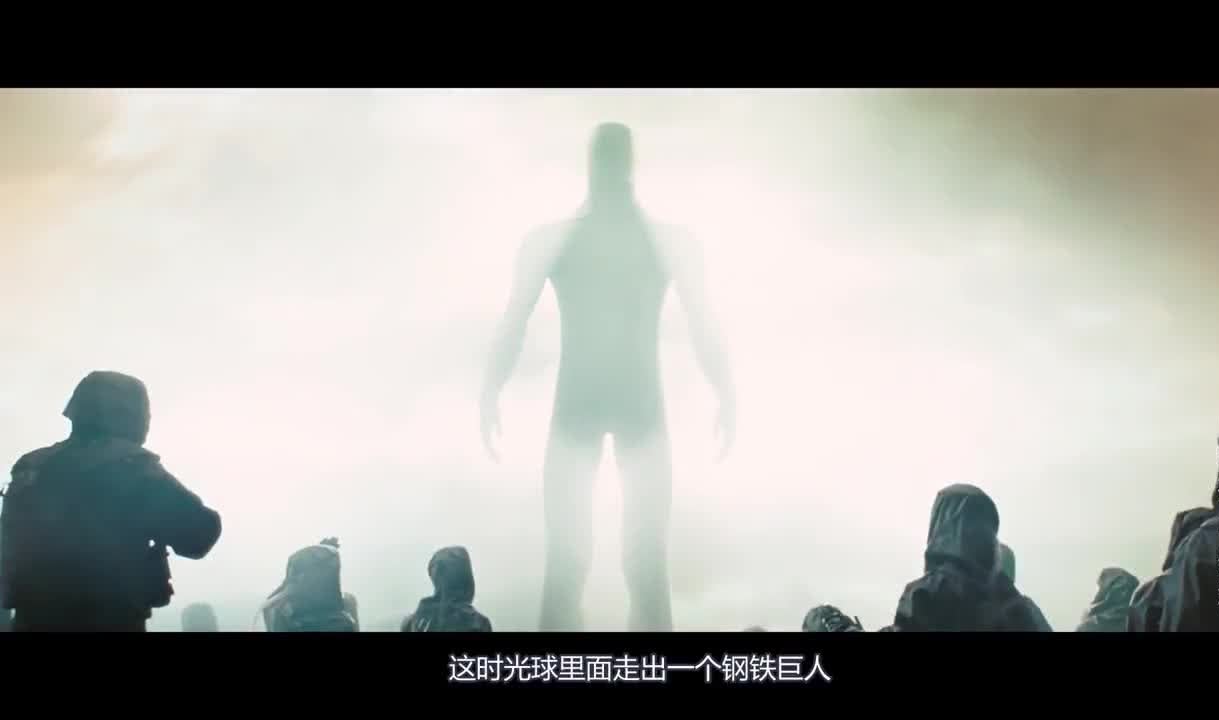 在双手即将交握的一瞬间,有一个士兵过度紧张,开枪崩了外星人,这时光球里面走出一个钢铁巨人,他一出现一瞪眼一嚎叫,所有机器都停止了运转,所有的人都停止了行动,在钢铁巨人要出手的时候,被崩了外星人抬手阻止了。