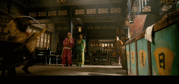 总的来说,《血迷宫》的故事简单,氛围冷峻,人物深沉;而《三枪拍案惊奇》的故事借鉴了传统剧目《三岔口》,把戏剧冲突浓缩到面馆里,又将剧情架构重新做了定位,起用小沈阳、程野和丫蛋这样喜剧形体夸张的演员,使得影片在悬疑的基础上又有了喜和闹,更不用说张艺谋一贯钟爱的视觉特色,使用了许多大全景来展现明艳的丹霞地貌。