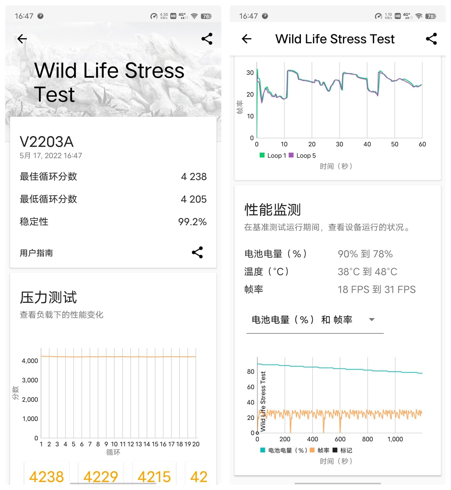 3dmark 的 wild life stress test 项目,连续 20 轮的高强度测试,vivo s15 获得了高达 99.2% 的稳定性,性能释放很出色。
