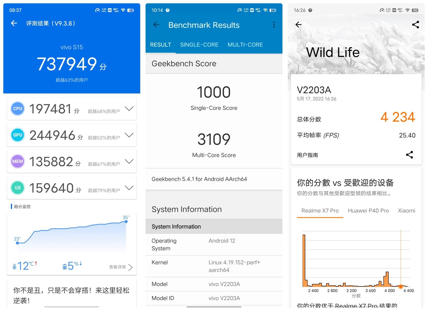 gpu 测试方面,在 3dmark 的 wild life 中,vivo s15e 获得了 4234 的总体分数,平均帧率为 25.40fps。