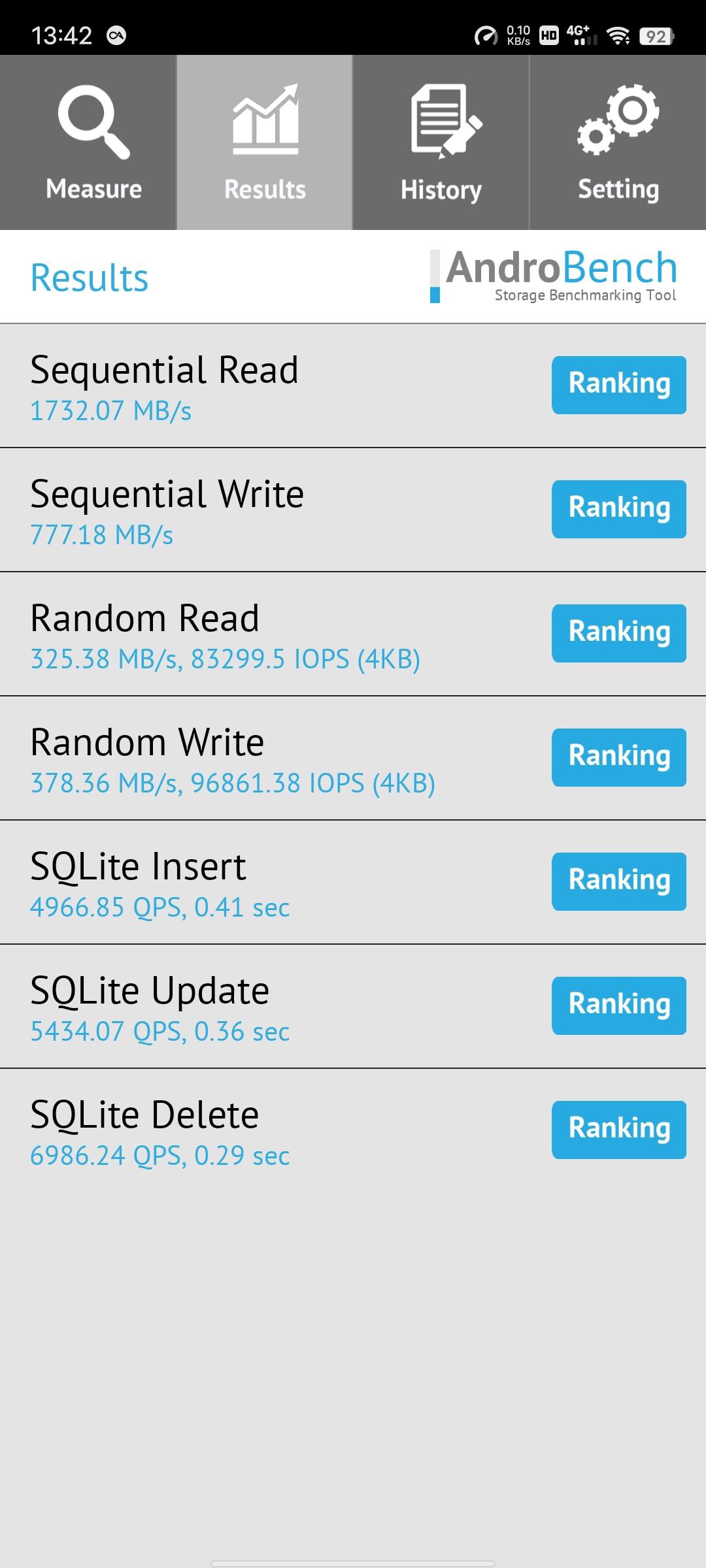 it之家拿到的 vivo s15 是 12+256gb 版本,通过 androbench 测得读取速度为 1732mb/s,符合 ufs 3.1 的表现: