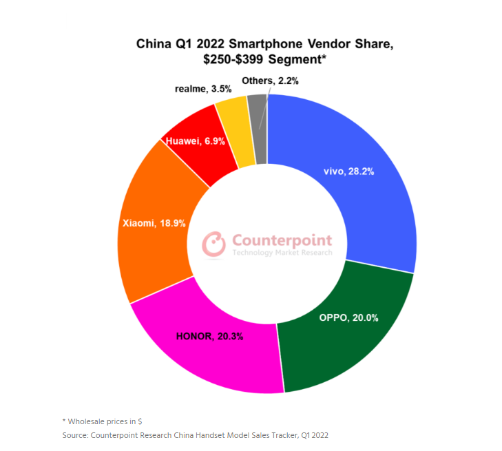 根据 counterpoint research 的中国手机销量跟踪报告,在中国智能手机市场 250 美元-399 美元(约 1697 元-2709 元,批发价)位段,vivo 在第一季度以 28.2% 的份额领先,在该价位段的 145 款机型中,vivo 的 s12 名列前茅,占总销量的近 9%。