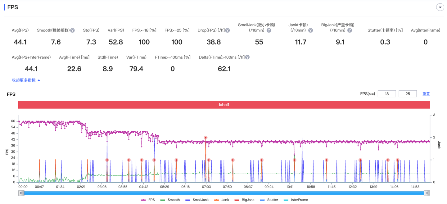 如下图所示,在 15 分钟左右的《原神》游戏中,vivo s15 的平均帧率为 44.1,稳帧指数为 7.6,稳帧指数指游戏时的画面平稳程度,该数值越小代表游戏越稳定,perfdog 官方给出的数据,一般游戏、视频建议小于 8。