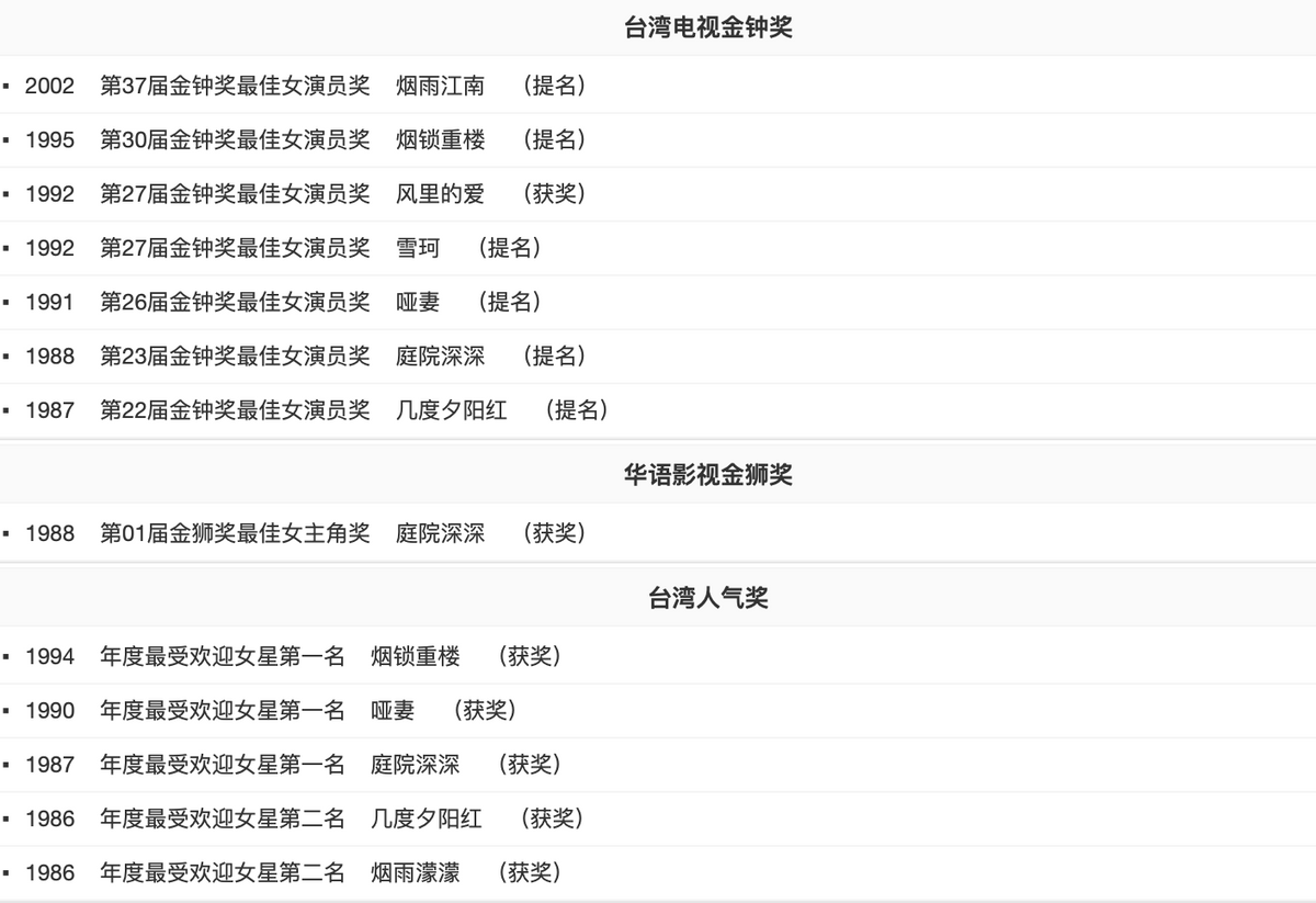 如果说香港是她出道之地,台湾就是刘雪华声名显赫之地,她绝大多数荣誉都是在台湾获得的。如果不是百度百科上标明“中国香港演员”,我一直以为她是台湾艺人。