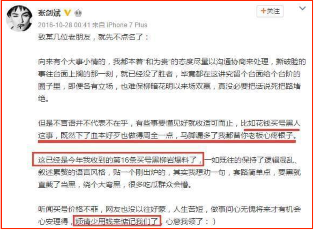 当时,不只"某男星被陷害"的新闻通稿席卷网站,柳岩的黑通稿也让人应接不暇,经纪人张剑斌不得不亲自下场,正面应敌。