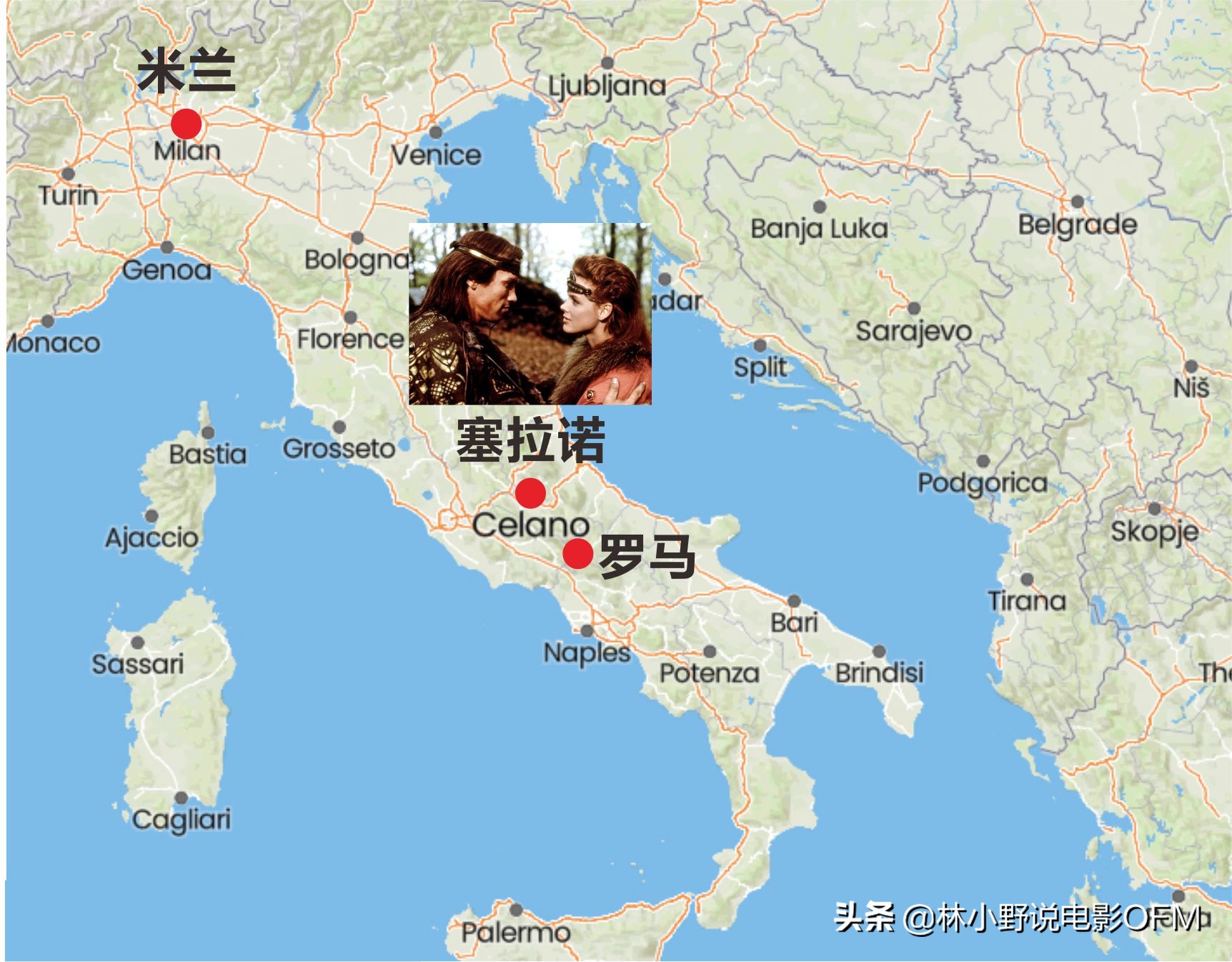 《女王神剑》大家都以为是在美国拍的,事实上这片取景地在意大利中部塞拉诺,地点荒僻,距离罗马120公里,平均海拔高度800米,人口不足8000人。