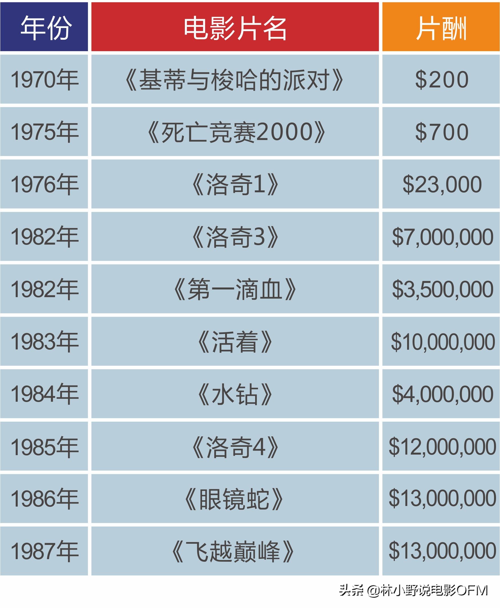 据不完全统计,截止1987年7月二人离婚时,史泰龙历年片酬收入,先给大家列个表单——