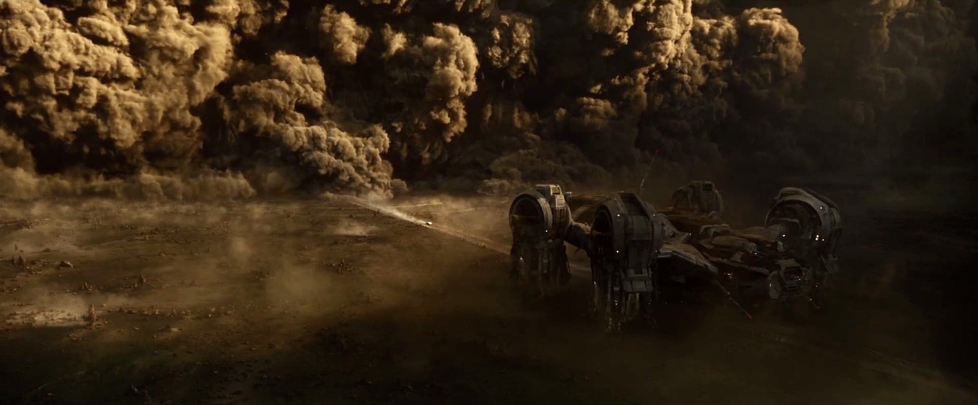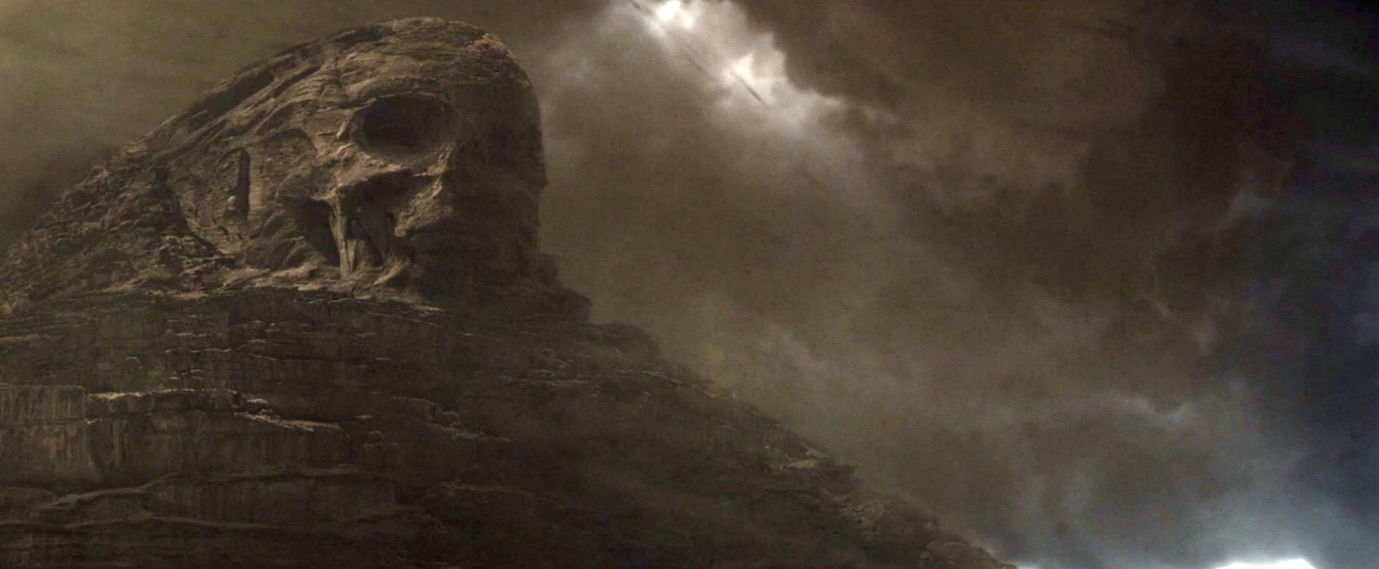 有种黑云压城城欲摧的感觉,浓烟滚滚而来,像是发生某种灾难一样,也很像我们看过的电影木乃伊当中的诅咒一样,这种隐晦的表达方式,和剧本相呼应,刚才说了,墙壁上文字写的内容是谁敢进去,你们将会受到惩罚。果然进去之后没一会儿,黑云压城就应验了。工程师圣殿头顶的骷髅头,之前老雷一直没有给到特写,刚好是黑云压城的这一刻,他们回撤的时候,最后一个镜头风暴扫到了骷髅头顶,老雷才给了一个全貌。
