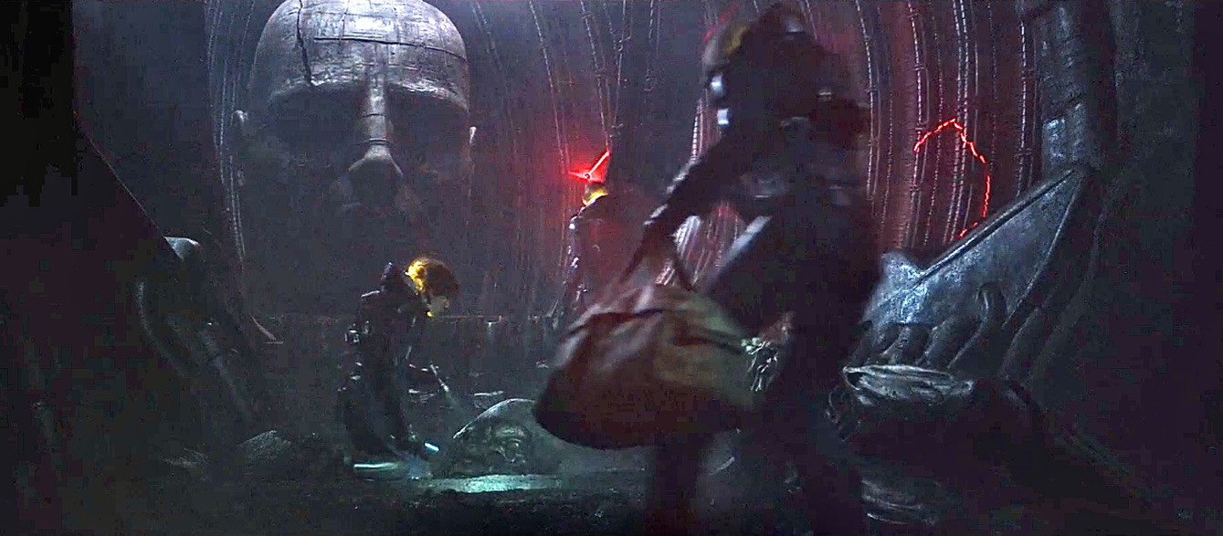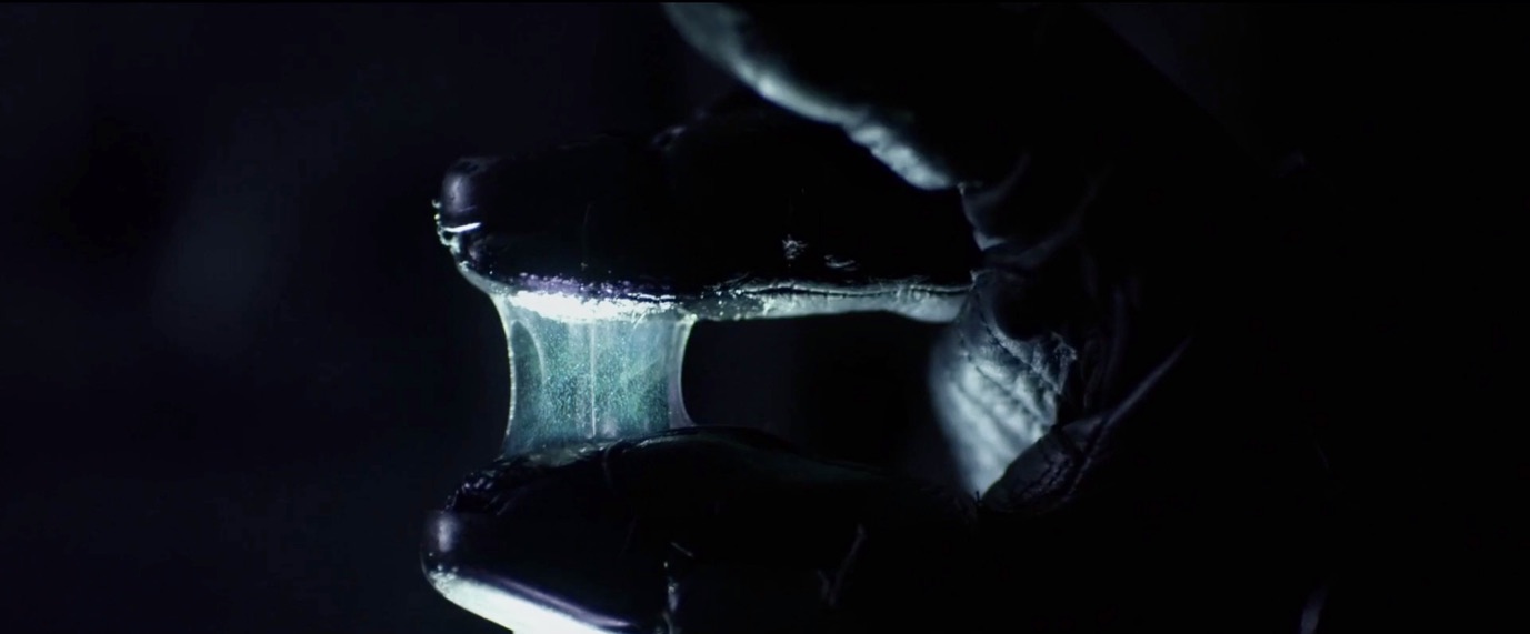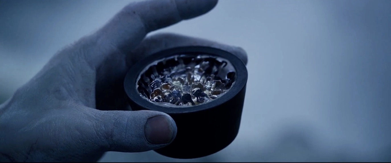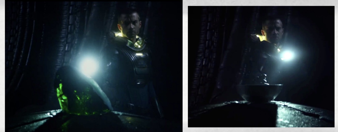 霍洛威走上祭坛,看到了一个类似绿色水晶一样的大型安瓿瓶,在早期拍摄的版本中,这里放置的是一个工程师的碗,和片头的碗很相似,后面之所以会换成绿色水晶,我认为还是和老雷的表达方式有关系,刻意放得更加隐晦一点,把答案留给观众去猜想。