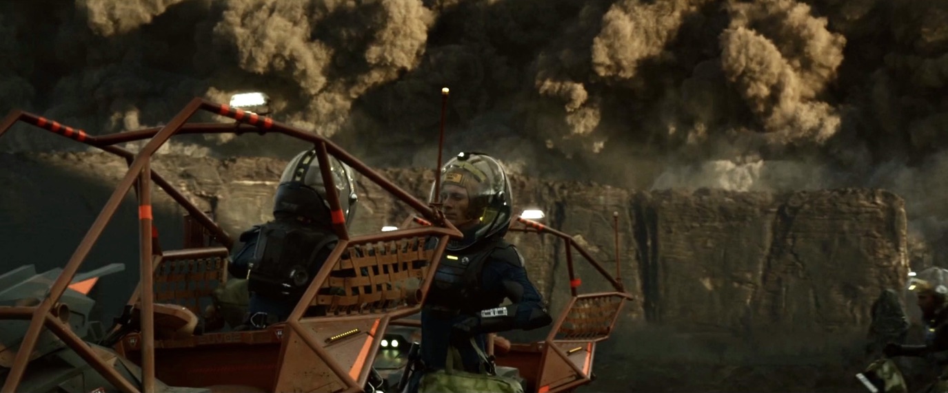 普罗米修斯的几个船员在室内待了一会儿之后,壁画开始变化褪色,说明人类进来之后,改变了里面的温度以及空气成分。就在这时诅咒马上应验了,普罗米修斯号突然发来信息告诉他们风暴即将来临,你们赶紧往回撤。回撤的过程把老雷的表达方式也体现得淋漓尽致,大家看到风暴了吗?