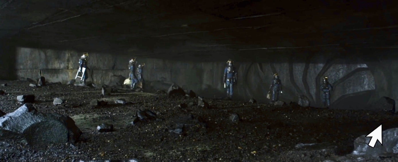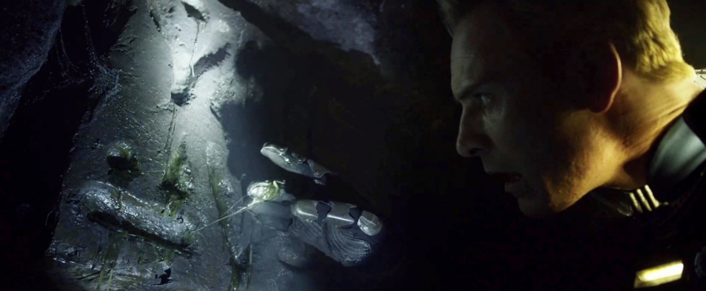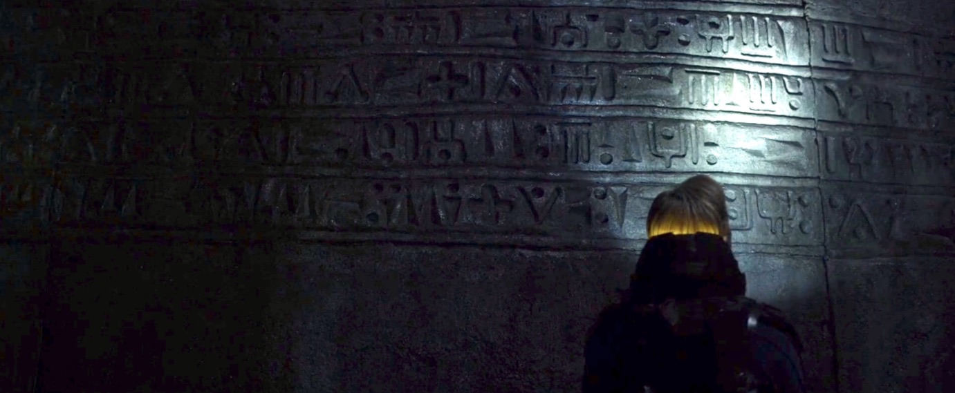 接下来看这面墙上写的内容,只有大卫看得懂,在剧本中已经诠释出了所有的信息。大致是说石门里面是工程师的神诞生的地方,是一个圣地,里面非常神圣,只有被选中的人才可以进入;一般人进去了将会受到惩罚,这句话真的应验了,稍后分析。