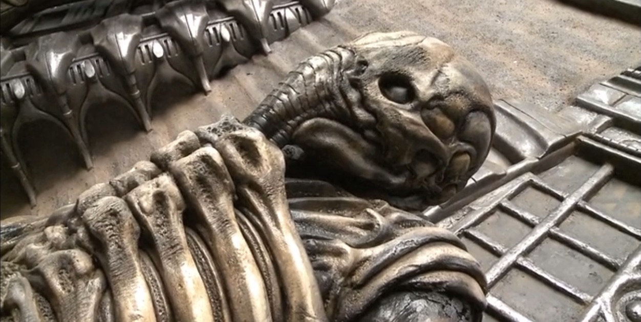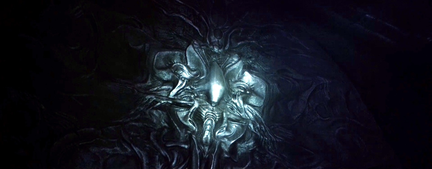 大卫进来之后看到一个巨大的人像石雕,普罗米修斯剧本中提到石雕上也刻有一些远古文字,大概的内容是讲述了工程师的神迪肯诞生的过程,以及迪肯的血液能让他们在宇宙的其他星系上诞生生命,就是我们在片头看到的工程师献祭播种的过程。