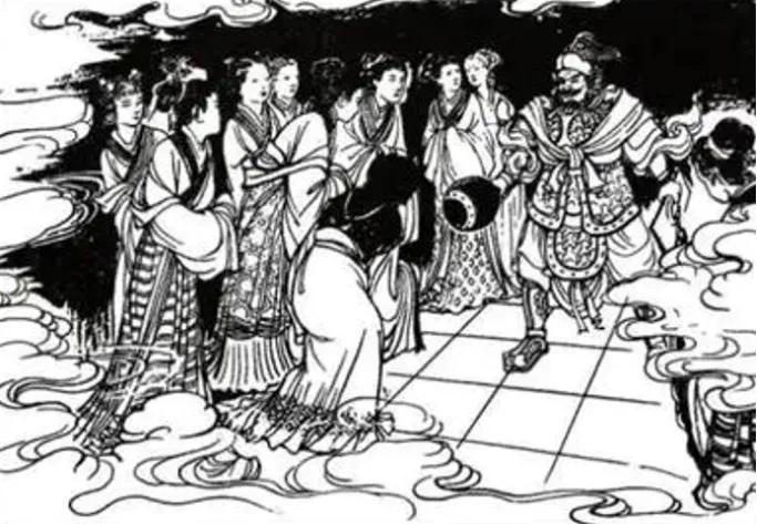 忽然,一阵“咚咚咚”的皮靴声传来,伴随着靴声,是“哗啦哗啦”的铁链声,接着是一片喧闹声、争辩声。散花仙女惊慌地从床上爬起,和朱生悄悄地向窗外看,只见一位穿着金色铠甲的武士,面如锅底,一手握着铜锤,一手提着铁链,众仙女将他围绕在中间。