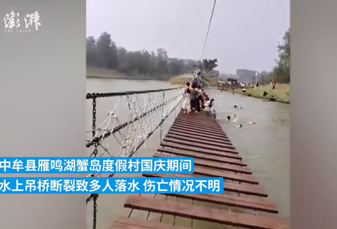 昨日(10月1日)上午,河南省郑州市中牟县雁鸣湖生态风景区一座网红吊桥,其中一侧的安全护栏和安全绳突然断裂,视频显示有多人在水中,当地应急管理部门工作人员称,有一名小男孩落水已被救起。