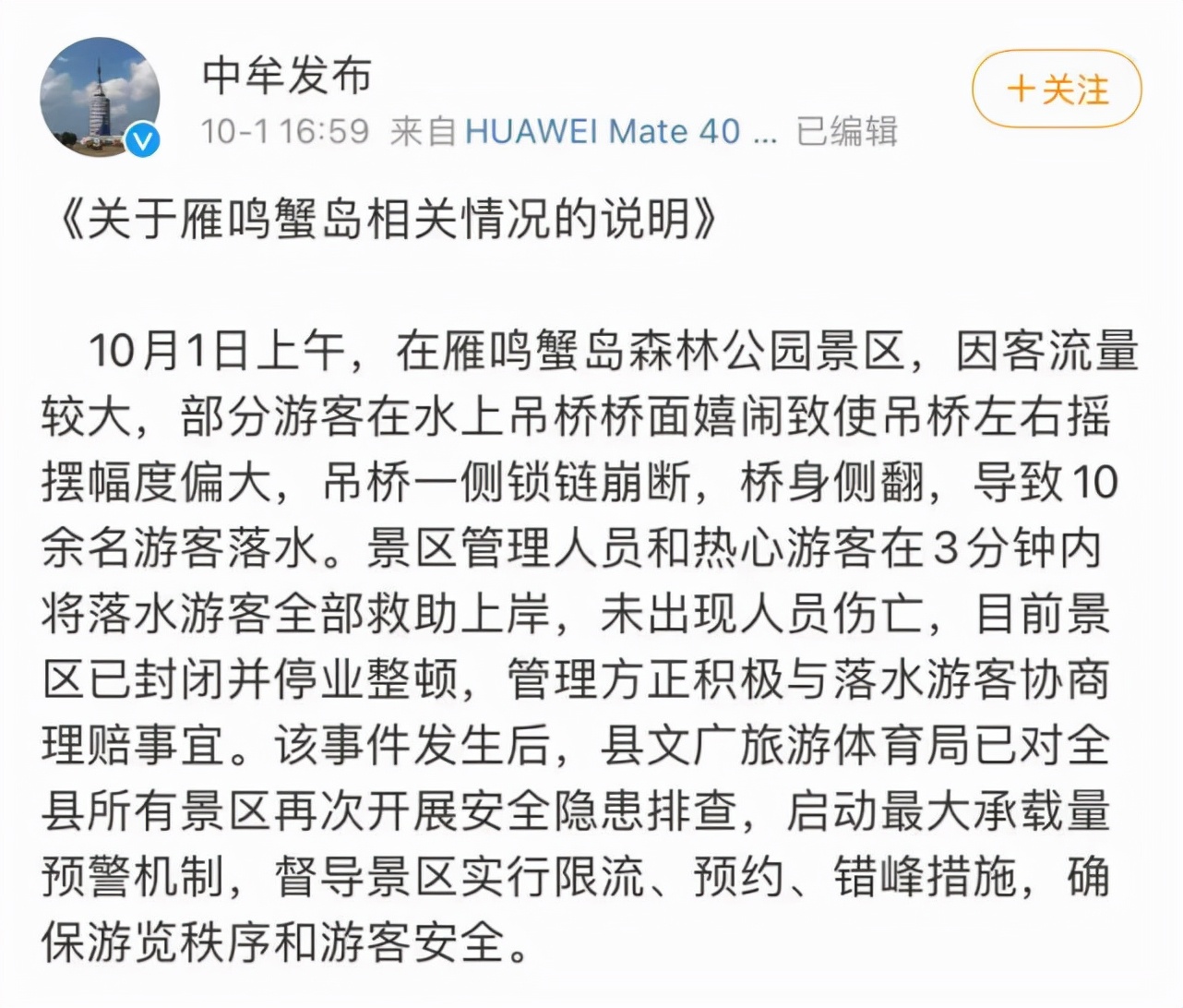据说明,10月1日上午,在雁鸣蟹岛森林公园景区,因客流量较大,部分游客在水上吊桥桥面嬉闹致使吊桥左右摇摆幅度偏大,吊桥一侧锁链崩断,桥身侧翻,导致10余名游客落水。景区管理人员和热心游客在3分钟内将落水游客全部救助上岸,未出现人员伤亡,目前景区已封闭并停业整顿,管理方正积极与落水游客协商理赔事宜。
