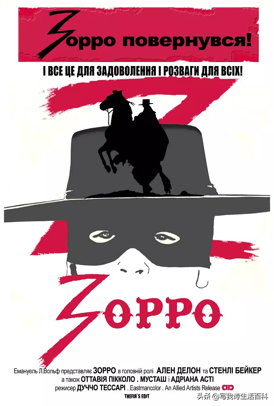 《佐罗》这部电影,由法国和意大利合拍。阿兰·德隆主演。说起佐罗,内地观众会把它和两个名字联系起来——佐罗的扮演者阿兰·德隆与中文配音演员童自荣。佐罗在中国,不只是集劫富济贫和潇洒英勇的代名词,佐罗,已经成为一个时代、一个群体的共同回忆。佐罗的面具、他的剑、他的黑马,他的皮鞭,和他的侠义事迹,都是人们心里对于“侠客”的最佳定义!+
