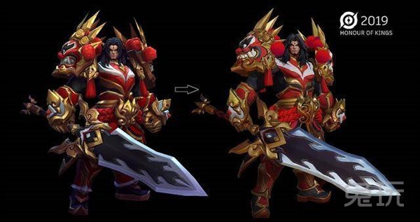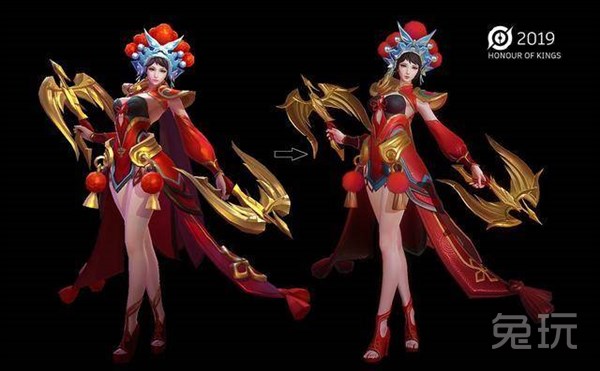 虞姬的霸王别姬优化较为明显,脸型原来是浮肿的,现在看起来好看很多,不过有一些网红脸的感觉。服装色调以及纹路都重新设计了,由原先的暗淡中国红变得鲜艳,除了服饰上的细节变化,身材比例变化也较大,以前的上半身有些夸张,腿也有些粗,现在优化后整体更加符合审美。