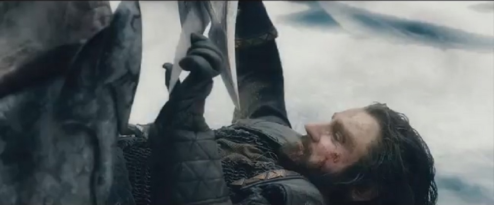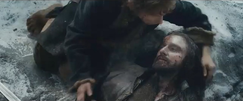 索林打不过阿佐格被压在了身下,最后一刻,他准备同归于尽。不抵抗对方的进攻,任由对方把刀插入自己的身体,同时他的刀也刺入了阿佐格。只要杀死阿佐格就能化解一切危险,用自己的命换取大家的安全。最终矮人王索林倒了下去,临死前乞求比尔博的原谅。