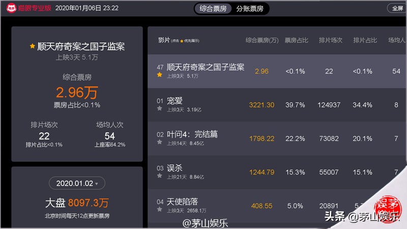 直到元旦当天,电影《顺天府奇案之国子监案》的票房数据终于在猫眼平台上出来了,大家猜猜有多少?22300,后面没有万哦,如果换算成万为单位,那就是2.23万,而同日上映的电影《宠爱》的票房已经高达2.86亿了。到了1月2号,《宠爱》票房已到了3.19亿,这天,《顺天府奇案之国子监案》的累计票房为5.1万,然后,就没有然后了,这部影片不得不下架了,目测投资人已哭晕在厕所,裤衩都赔光了。