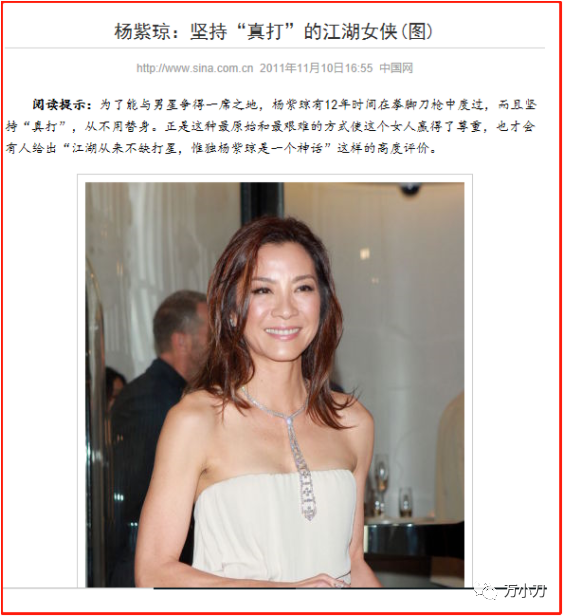 她三十几年真枪实战的“女侠”生涯,使得业内一直流传着一个美丽的传说:“江湖从来不缺打星,唯独杨紫琼,是一个神话。”