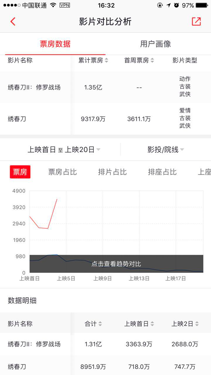电影《绣春刀·修罗战场》7月19日全国上映以来,票房持续稳健,连续四天稳坐当日单片票房、票房占比、观影人次冠军宝座,只用三天半即超越前作总票房,并迅速破亿再创新高,带动当日大盘持续飙升。同时影片公映后的豆瓣评分始终保持7.7分,更超前作的7,5分,实现票房口碑双逆袭,显示强大硬实力。截至7月23日16:30,影片已累计1.59亿,单日票房、观影人次更超首日实现华丽逆增长,杨幂也在微博首发精彩片段,感谢观众的支持。
