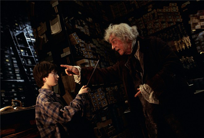 如今重温第一部可以发现,其实满满都是暗藏的伏笔与线索。作为一年级新生的哈利·波特,在对角巷买下了自己的第一根魔杖。懵懵懂懂的他挥舞着魔杖,差点拆了奥利凡德魔杖店。而当命定的魔杖被交到哈利手中,奥利凡德说出哈利手中的魔杖与他头上闪电疤痕的关系时,那场最终宿命的魔杖对决,在那一刻,其实已然注定。