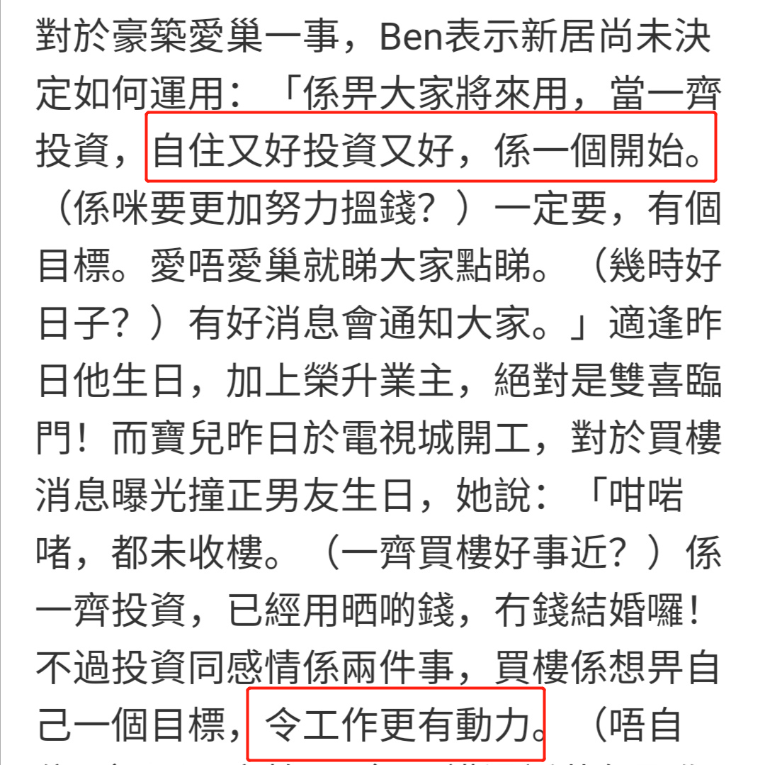 对于买豪宅一事,袁伟豪表示新房子并未决定是用来投资还是自住,张宝儿则称,买楼是想给自己一个目标,令工作更有动力。对于结婚传闻,两人只表示有好消息定会告诉大家。