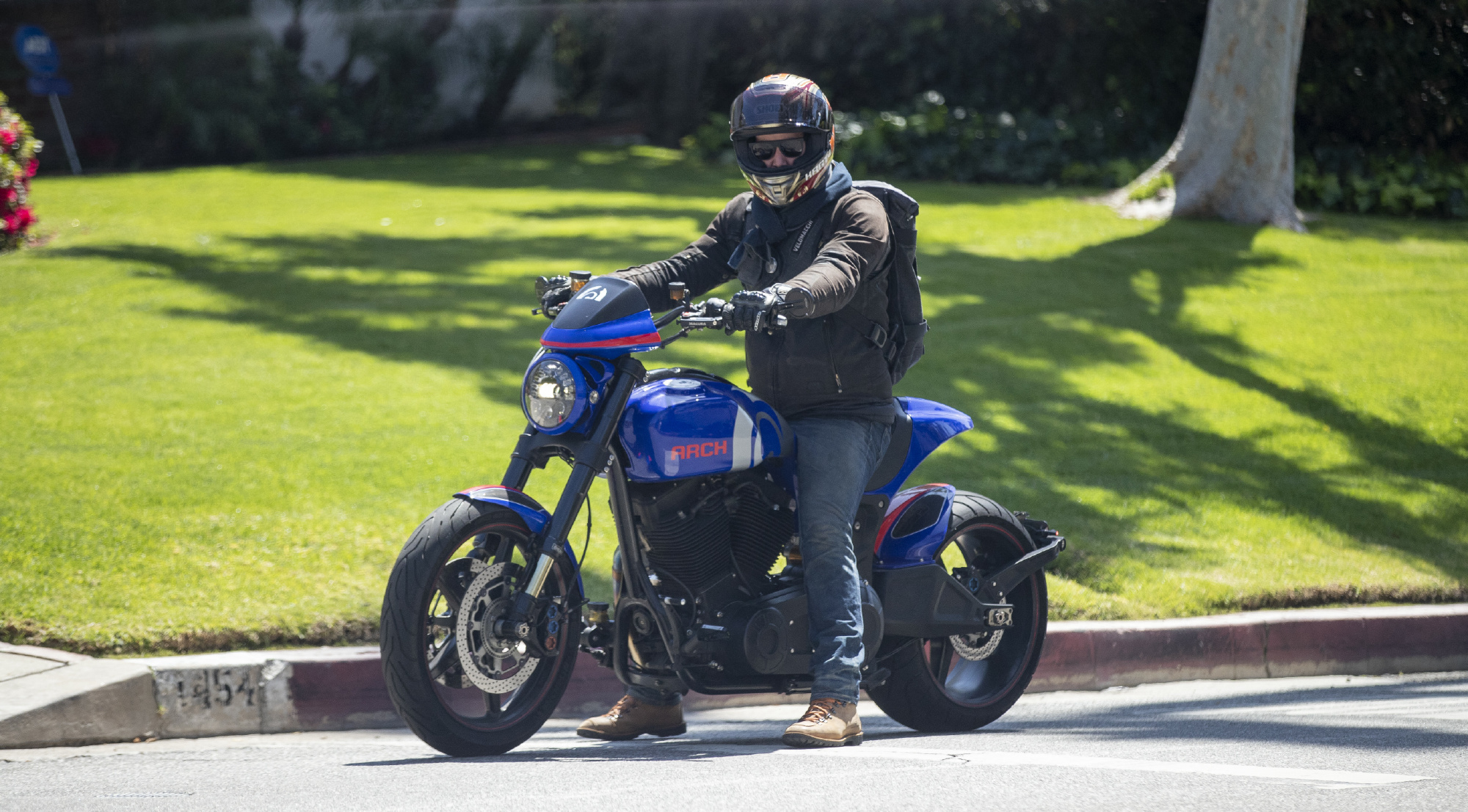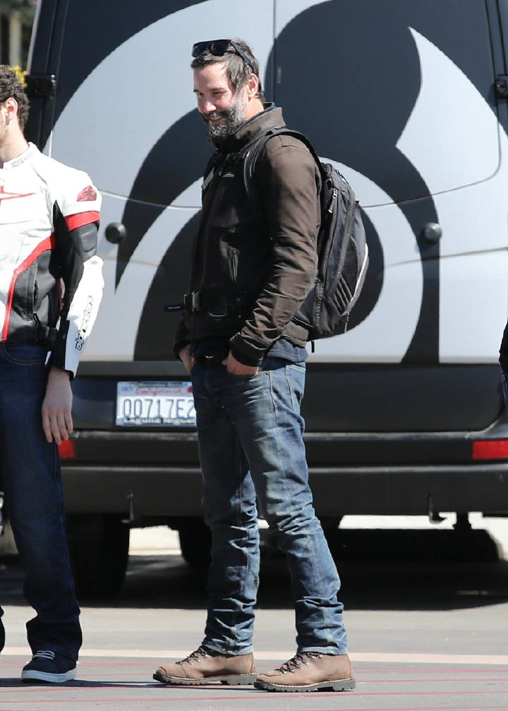 图中的基努·里维斯骑着一辆蓝色的摩托车帅气现身,身上的打扮也是十分休闲,穿着灰色棉服与深蓝色牛仔裤,还背着双肩背包,脸上更是包裹的很严实,不仅戴着头盔,还戴着一个黑色的墨镜。