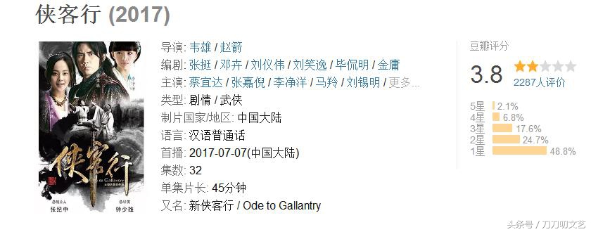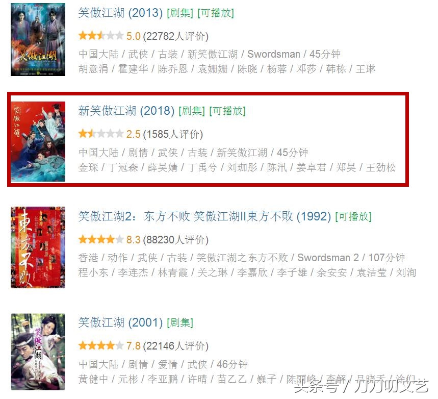5年前,于正版《笑傲》的豆瓣评分,只有5.0,结果2018年刚开年《新笑傲江湖》就刷新了口碑下限。也同时,《新笑傲江湖》以低于央视版《侠客行》的豆瓣评分(3.8分)的成绩,目前成为金庸剧当中的豆瓣最低分。
