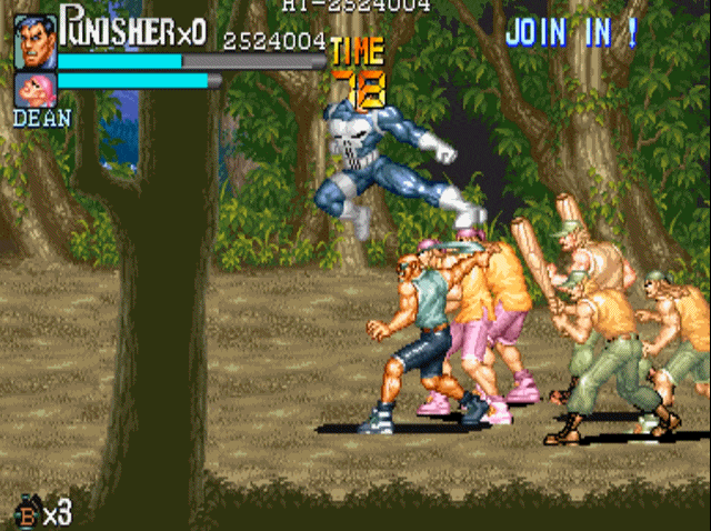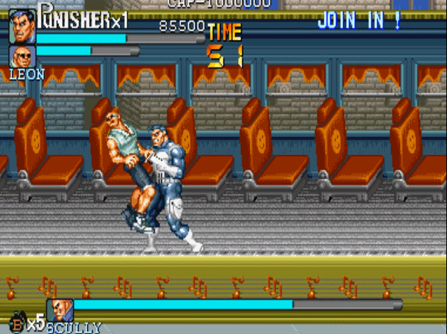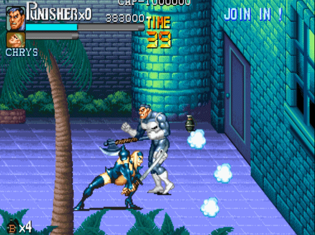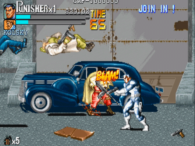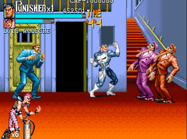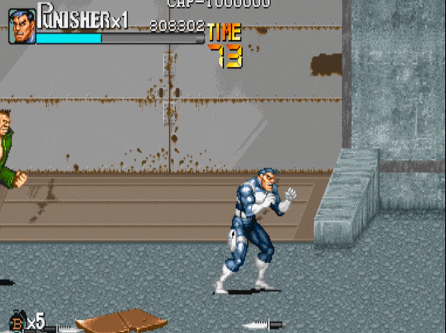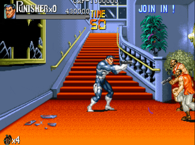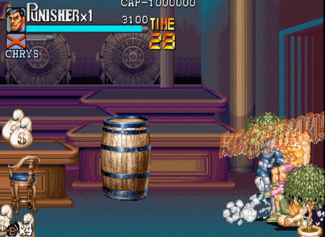 说到街机上的横版动作游戏,就不得不提到capcom的大名。诸如我们熟悉的《圆桌骑士》《恐龙快打》《吞食天地》和《快打旋风》均是出自这家公司。当然,下面我们要说的《惩罚者》也不例外,可以说在90年代中capcom在街机上推出的横版动作游戏,几乎成为了这一类游戏的代名词。1993年,capcom根据漫威同名漫画改编的游戏《惩罚者》上市,爽快的打击感与武器的多样性,使得该作推出后就受到了广大玩家的好评。游戏的操作方式继承了“先辈”(1989年推出的《快打旋风》)优良血统的同时,更是追加了极具特色的机制设定。