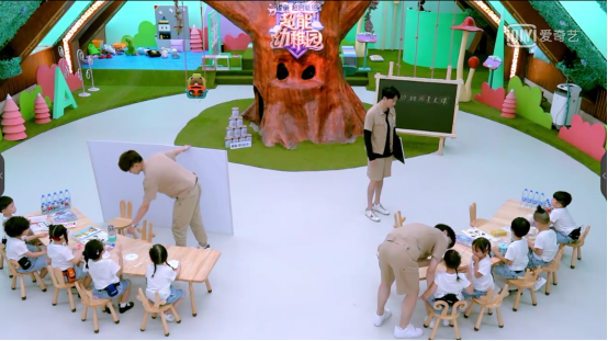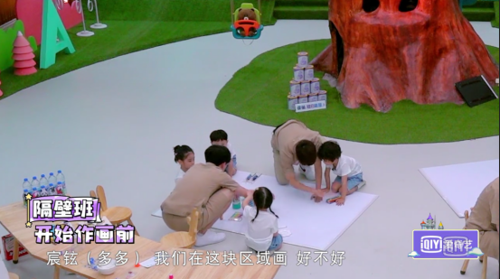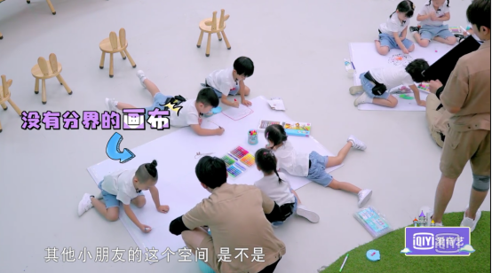他们教育理念的不同还体现在他们的画布上,任嘉伦在画之前就已经给大家划分出了区域,因为他觉得需要教导小朋友规则意识。俞灏明班的画布则是没有界限的,因为他希望在这个阶段,孩子们是没有局限的,不要束缚他们的想象力。