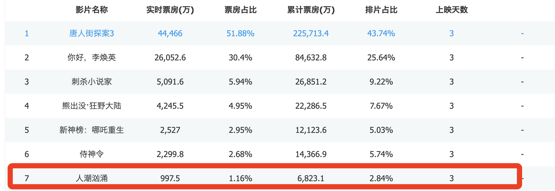 无论你喜欢那部电影,摆在我们面前的事实就是,春节档的《人潮汹涌》的票房表现很差劲
