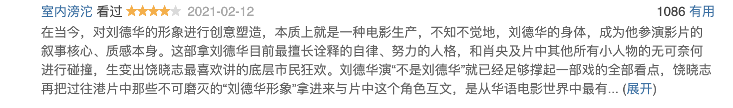 把一个天王巨星重新放到一个跑龙套的定位,让刘德华重返过气香港电影最辉煌,也最辛苦的那个打拼的年代,所以这是一部重新定义刘德华演技的电影。