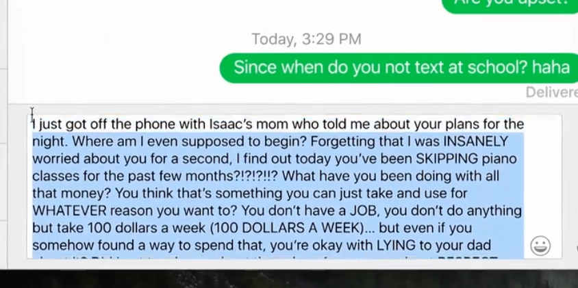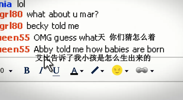 影片用屏幕上的文字取代视觉化的"台词",这样的文字相较于台词有着不同的表现方式。人物说台词时可以用语气、神态来表达感情,而影片中的人能够飞快地输入信息,情感的表达可以通过用词和标点符号来呈现。令人印象深刻的一处是父亲一开始责备女儿,打了一大串文字最后觉得不妥删掉,表现了亲情交流的障碍。