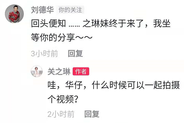 连男神刘德华都赶过来抢占热评第一。刘德华说:“回头便知,之琳妹终于来了,我坐等你的分享”,关之琳则在底下回复:“哇,华仔,什么时候可以一起拍摄个视频。”