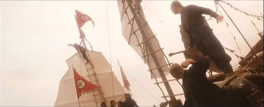黄飞鸿师徒假扮成米商,驾着一艘船出海,果然很快就吸引了红旗帮的海盗上船劫掠。