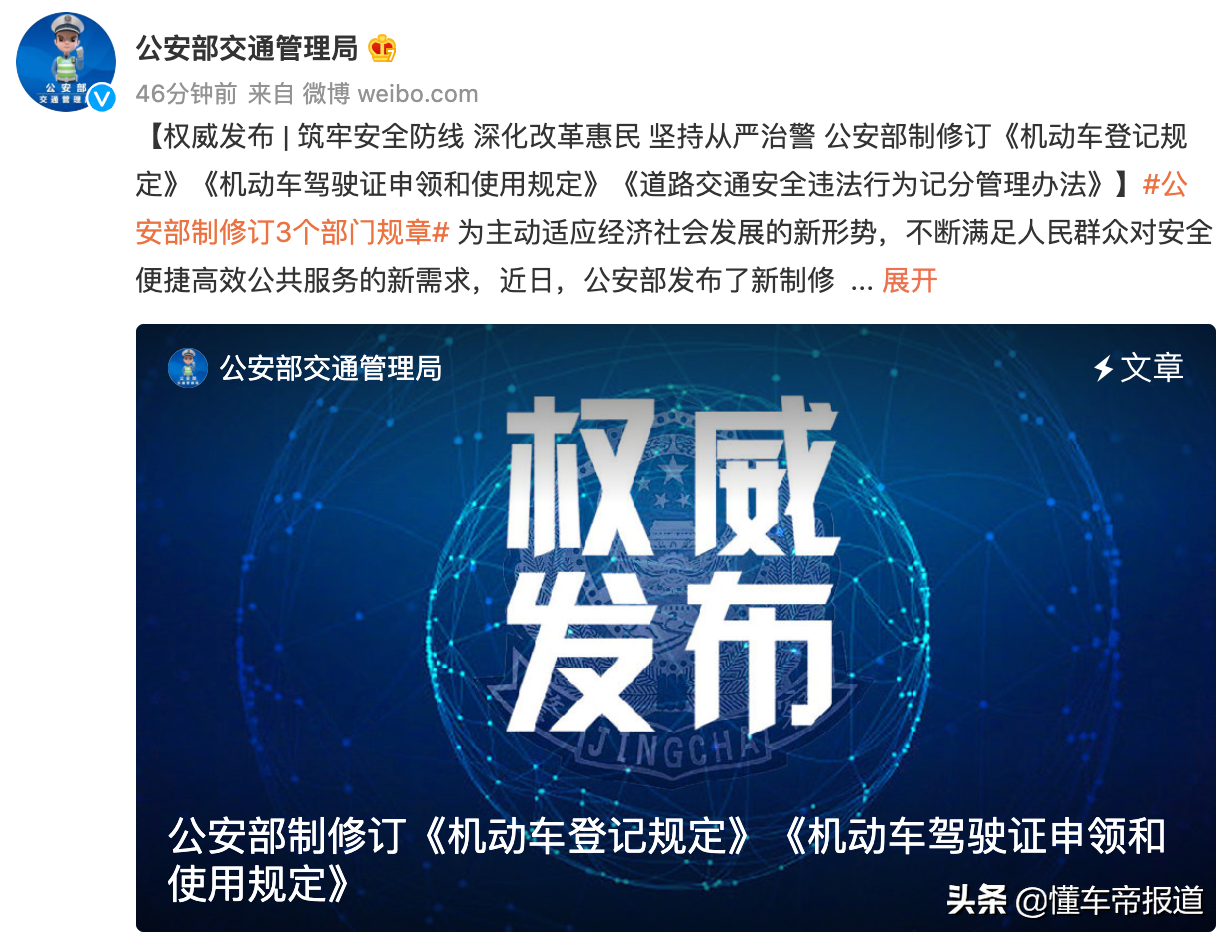 [懂车帝原创 行业] 2021年底,公安部发布了新制修订的《机动车登记规定》《机动车驾驶证申领和使用规定》《道路交通安全违法行为记分管理办法》3个部门规章。