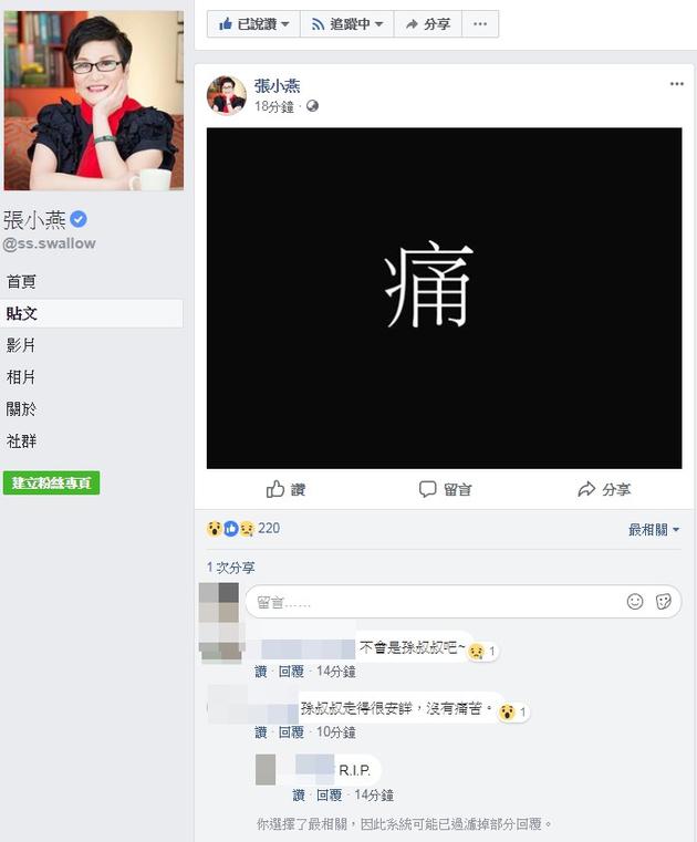 甚至1日晚间病逝台大医院,家属低调并未公开消息,一直到张小燕2日晚间脸书发文哀悼才曝光。长子孙向竹、女儿孙向莹随后公开回应,孙越后事已在下午办完,预计会另外举办追思纪念会。