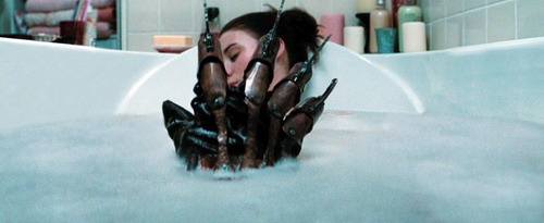 1、为拍摄女主角在浴缸中被袭击的场景,剧组在别墅布景的二楼修建了一层楼高的水槽,在里面灌满水,女主南希踩在二楼的浴缸边缘,好让特技演员在水槽中有足够的容身之处,套上“鬼爪”从水中浮现。