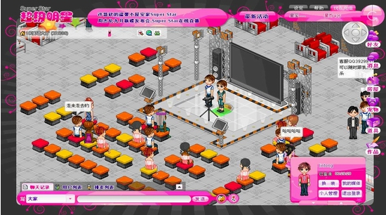 “超级明星”是一款以音乐为主的网页游戏,每个人注册以后都有个虚拟的人物,在游戏里你可以建立自己的经纪公司,或者唱片公司。可以签约其他艺人,发布唱片在网站上。还有排行榜,你也可以入别人的公司。网站里设置了好多明星屋,比如:周杰伦小屋,李宇春小屋,弦子小屋,张杰小屋等等进入他们的小屋可以点击听他们的歌,时不时的官方也会把真正的明星请来助阵一下。