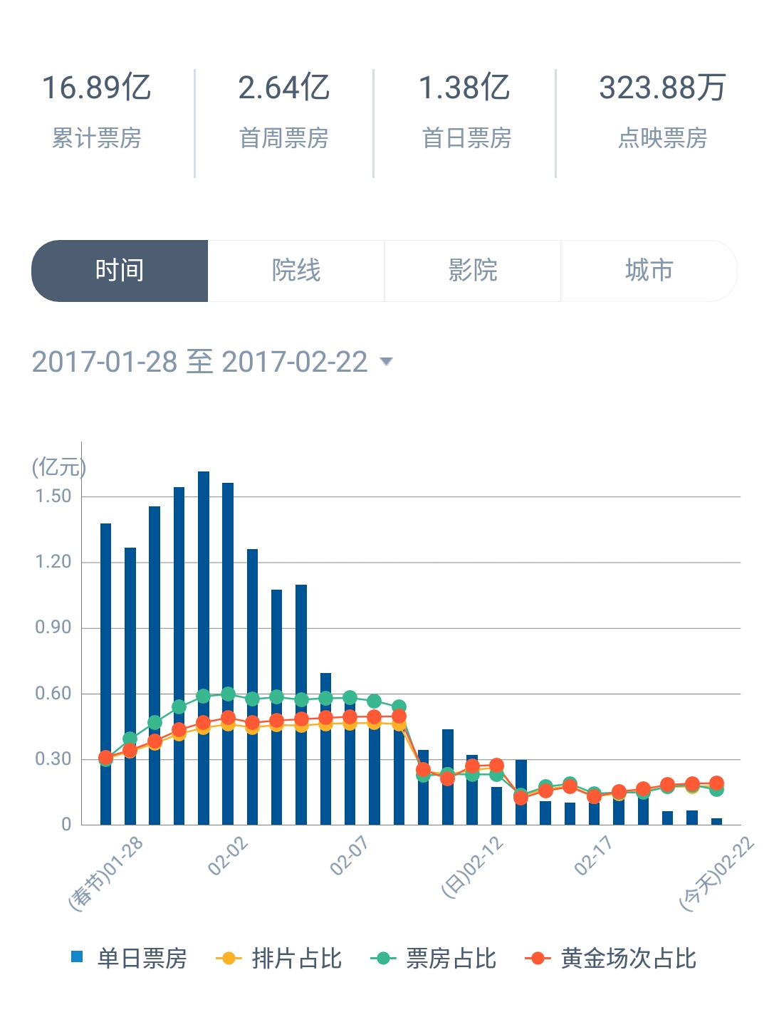 小评:周日大盘环比下跌17%报收1.65亿;本周在情人节加持下,大盘守住10亿关口,七天报收12.02亿。#极限特工:终极回归#次周近5亿,较首周上涨17%,累计票房破9亿。#爱乐之城#首周六天收入1.68亿,其中情人节单日就占了42%。#欢乐好声音#首周三天报收8200万,成绩稍逊于#海洋奇缘#首周的8560万。#熊出没·奇幻空间#累计破5亿,成为2017年首部破5亿的动画电影。