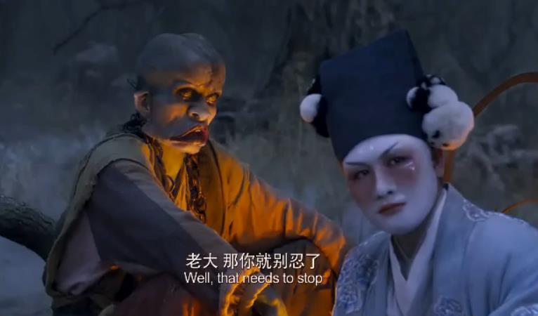 不过,在被解构的原著情节的另一面,貌似和谐的师徒关系却始终充满着变数:不是唐僧不信任悟空,而是因为后者打死了自己的心上人而暗生敌意,只是碍于自己出家人的身份而有苦难言,唯有通过鞭挞对方来试图释怀。而对于悟空来说,唐僧动不动在其他两位师弟面前叫自己“臭猴子”,还打他,但碍于师徒关系,他也只能压抑着尊严被践踏的痛楚而忍气吞声。
