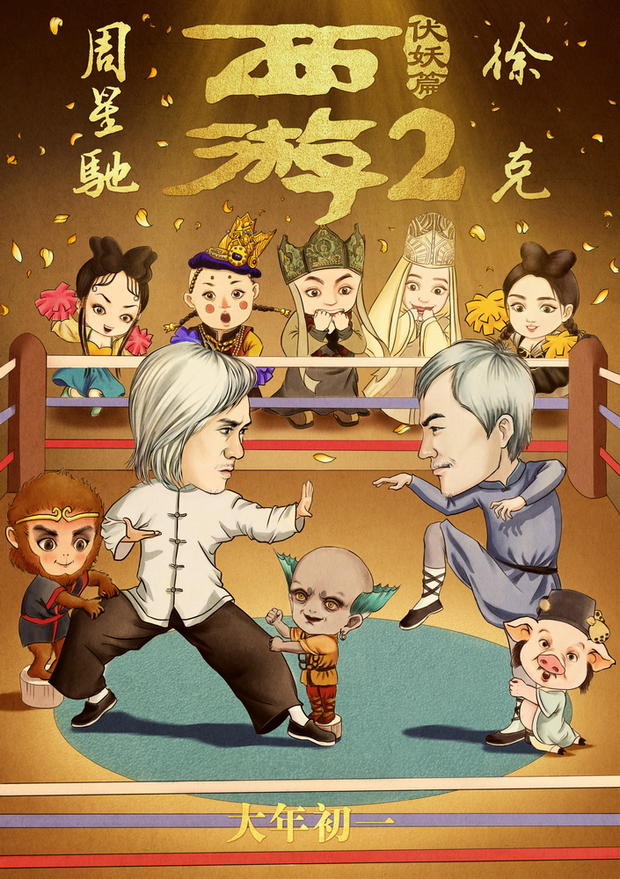 《伏妖篇》海报随着本次预告片发布的还有电影的漫画海报,海报上星爷与徐克双双站在擂台上。星爷一身白衣黑裤,像极了《功夫》时的造型,而徐克则是同样一身武装打扮,海报上还有电影中的各类角色,海报喜感颇足。