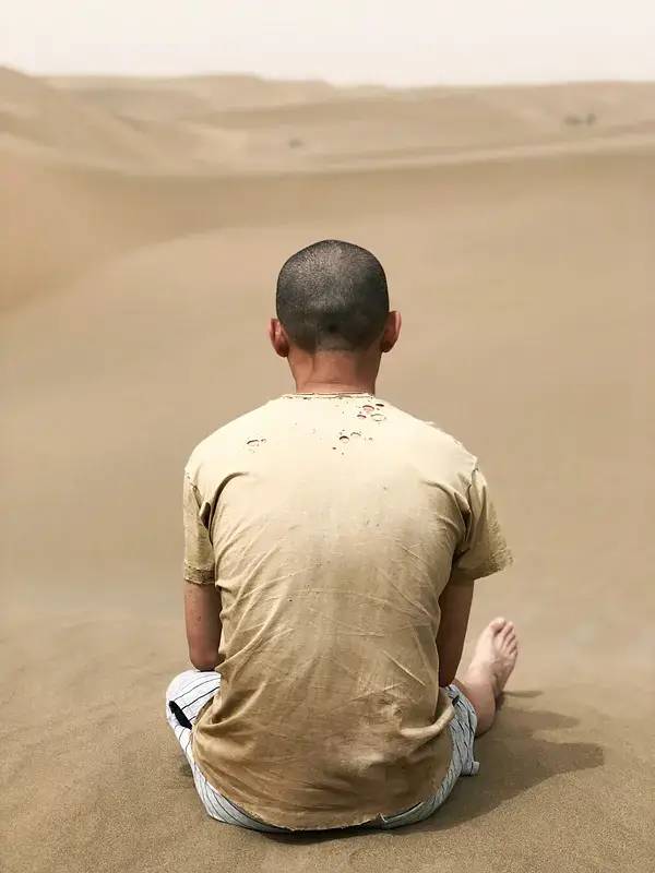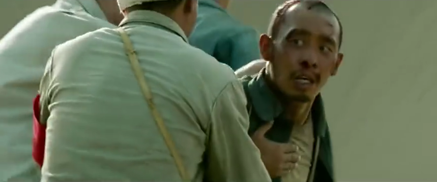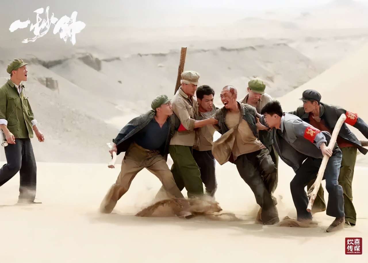在一片广袤的荒漠上,张译饰演的农村汉子被一群衣着袖章的人带走,他留着寸头,额头有着斑斑血迹,他几次回头,眼神焦急地看着远方,嘴里有千言万语却只能沉默,在周围人的推搡下他遗憾离开。