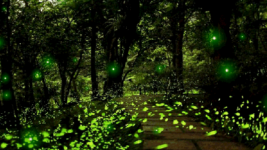 一般在六月底到七月底,入夜后的森林,暑气开始消散之时,萤火虫们就会从草木中飞出来交配,它们飞舞出一道又一道绿色的轨迹,绿星点点。
