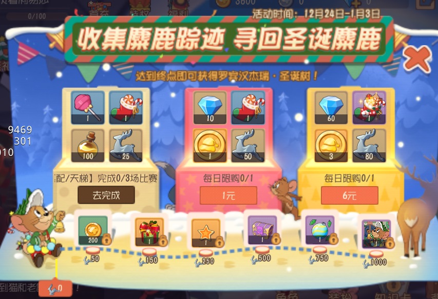 小伙伴们通过完成每日任务、购买圣诞麋鹿踪迹礼包,可以获得麋鹿踪迹、圣诞袜等奖励内容。累计获得的麋鹿踪迹,积累麋鹿踪迹达到一定额度,就能解锁丰富的奖励,包括星星、金币、自选a级知识卡,甚至还有限定的全新a级皮肤“罗宾汉杰瑞·圣诞树”及彩饰!一起来寻回麋鹿吧。