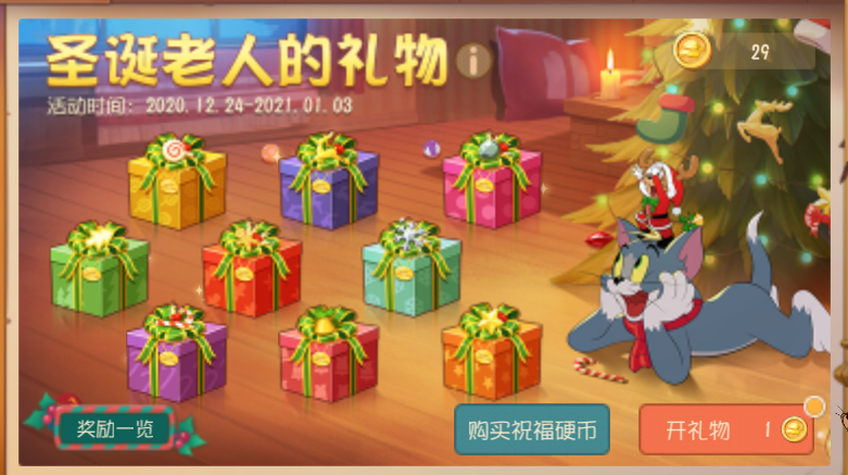 传说在圣诞节,圣诞老人会驾着麋鹿雪橇,从烟囱进入屋子,偷偷把礼物放在好孩子床头的袜子里。在《猫和老鼠》手游中,圣诞老人同样给小伙伴们准备了礼物,而且还是九份哦!在活动期间,消耗金币或者钻石,可以在商城购买“祝福硬币”。打开礼物需要消耗一定的“祝福硬币”,随着礼物的开启,消耗的数量依次提升。