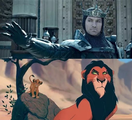 裘·德洛在片中饰演亚瑟的蜀黍,对应了《狮子王》中的刀疤