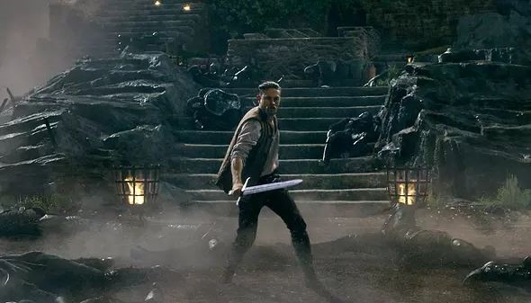 虽然《福尔摩斯》风评一般,但动作戏引人入胜,可看性不低。于是盖·里奇再接再厉,大刀阔斧地拍出了《亚瑟王:斗兽争霸》,试图把亚瑟王的传说讲出黑色犯罪片的感觉——影片也以“黑帮摇滚风”作为宣传噱头,将古代传说融入现代摇滚。