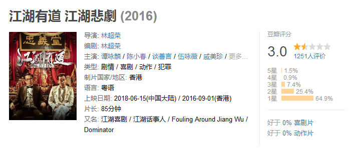 可惜,《江湖有道》并没有取得理想的口碑,甚至能用“一塌糊涂”四个字来形容,豆瓣评分仅3.0,64%观众打一星,堪称史诗级烂片,同时创下陈小春出道以来评分最低记录,完全算是陈小春输得最惨的一次!